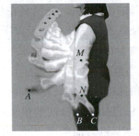 3. (多选,2024 安徽合肥六校联盟期中)人们在洗手后往往有如图所示的甩手动作,这幅图片是由每秒$25$帧的摄像机拍摄视频后制作的频闪画面(相邻两帧间的时间间隔为$0.04s$),图中$A$、$B$、$C$是甩手动作最后连续$3$帧照片指尖的位置。指尖从$A$到$C$的运动过程,可以看作:指尖先以肘关节$M$为圆心做圆周运动,指尖到达$B$点后又以腕关节$N$(视为已经静止)为圆心做圆周运动,最终到达$C$点静止(可粗略认为指尖在$A$、$B$间运动的平均速度大小等于指尖过$B$点的线速度大小)。测得$A$、$B$之间的真实距离为$0.32m$,$AM$的真实长度为$0.40m$,$CN$的真实长度为$0.16m$,重力加速度$g$取$10m/s^2$。结合以上信息,则下列说法正确的是(