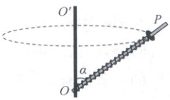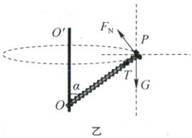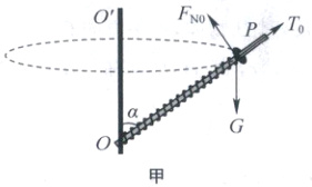 (3)圆环处于细杆末端$P$时,对圆环受力分析,如图乙所示,圆环受重力和支持力,此时弹簧伸长,则圆环所受弹力沿杆向下。根据胡克定律,有$T = k(L - x_0) = 10 N$,对圆环所受的力进行正交分解,竖直方向受力平衡,水平方向的合力提供向心力,有$mg + T\cos\alpha = F_N\sin\alpha$,$T\sin\alpha + F_N\cos\alpha = m\omega^2r'$,由几何关系得,圆环此时转动的半径为$r' = L\sin\alpha$,联立解得$\omega = 10 rad/s$。