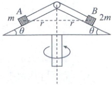 9. (多选)如图所示,在倾角为θ=37°的角锥体表面上对称地放着可视为质点的 A、B 两个物体,用一轻质绳跨过固定在顶部的光滑的定滑轮连接在一起,开始时绳子绷直但无张力.已知 A、B 两个物体的质量分别为 m 和 2m,它们与竖直轴的距离均为 r=1 m,两物体与角锥体表面的动摩擦因数为 0.8,认为最大静摩擦力等于滑动摩擦力,重力加速度取 g=10 m/s²,某时刻起,圆锥体绕竖直轴缓慢加速转动,加速转动过程中 A、B 两物体始终与角锥体保持相对静止,则下列说法正确的是 (