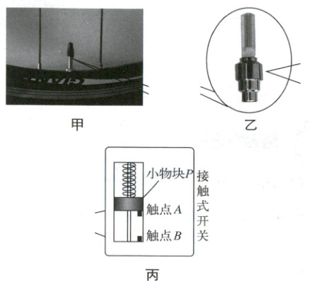 4. (多选,2025 江西景德镇一中期末)如图甲、乙所示为自行车气嘴灯,气嘴灯由接触式开关控制,其结构如图丙所示,弹簧一端固定在顶部,另一端与小物块 $ P $ 连接,当车轮转动的角速度达到一定值时,$ P $ 拉伸弹簧后使触点 $ A $、$ B $ 接触,从而接通电路使气嘴灯发光。触点 $ B $ 与车轮圆心距离为 $ R $,车轮静止且气嘴灯在最低点时触点 $ A $、$ B $ 距离为 $ d $,$ d \leq R $,已知 $ P $ 与触点 $ A $ 的总质量为 $ m $,弹簧劲度系数为 $ k $,重力加速度大小为 $ g $,不计接触式开关中的一切摩擦,小物块 $ P $ 和触点 $ A $、$ B $ 均视为质点,则(