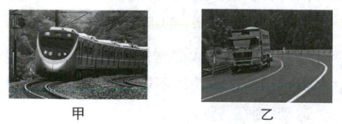 2. (2024 四川泸州期末)在修筑铁路时,弯道处的外轨会略高于内轨(如图甲所示),当火车以规定的行驶速度转弯时,内、外轨均不会受到轮缘的挤压,设此时的速度大小为 $ v_1 $。在修建一些急转弯的公路时,通常也会将弯道设置成外高内低(如图乙所示)。当汽车以规定的行驶速度转弯时,可不受地面的侧向摩擦力,设此时的速度大小为 $ v_2 $,重力加速度为 $ g $。以下说法中正确的是(