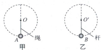 5. (2024 四川遂宁期末)如图甲、乙所示,分别用长度均为 $ 1m $ 的轻质细绳和轻质细杆的一端固定连接质量均为 $ 1kg $ 的小球 $ A $、$ B $,另一端分别固定在 $ O $、$ O' $ 点,现让 $ A $、$ B $ 两小球分别绕 $ O $、$ O' $ 点在竖直平面内做圆周运动,小球均可视为质点,不计空气阻力,重力加速度 $ g $ 取 $ 10m/s^2 $。下列说法不正确的是(