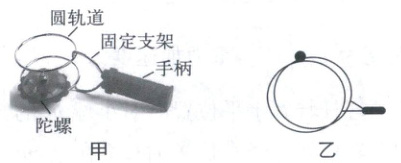 7. (2024 河北邯郸期中联考)如图甲所示为一种叫“魔力陀螺”的玩具,其结构可简化为图乙所示。铁质圆轨道用支架固定在竖直平面内,质量为 $ m $、可视为质点的陀螺在轨道内、外两侧均可以旋转,半径均为 $ R $,陀螺磁芯对轨道的吸引力始终沿轨道半径的方向,大小恒为 $ 6mg $。不计摩擦和空气阻力,重力加速度为 $ g $。下列说法正确的是(