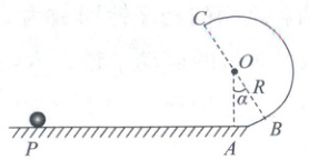 6. (北京西城期中)如图所示,在竖直平面内,一半径为 $ R $ 的圆弧轨道 $ ABC $ 和水平轨道 $ PA $ 在 $ A $ 点相切,$ BC $ 为圆弧轨道的直径,$ O $ 为圆心,$ OA $ 和 $ OB $ 之间的夹角为 $ \alpha $,$ \cos \alpha = \frac{4}{5} $。一质量为 $ m $ 的小球沿水平轨道向右运动,经 $ A $ 点沿圆弧轨道通过 $ C $ 点,落至水平轨道;在整个过程中,除受到重力及轨道作用力外,小球还一直受到一水平恒力的作用。已知小球在 $ C $ 点所受合力的方向指向圆心,且此时小球对轨道的压力恰好为 $ 0 $。不计一切摩擦,重力加速度大小为 $ g $,下列说法