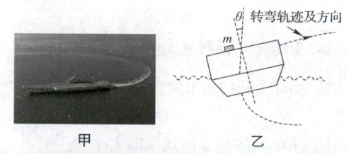 8. (多选,2024 陕西渭南期中)如图甲所示,一艘正在进行顺时针急转弯训练的航母,运动轨迹可视作半径为 $ R $ 的水平圆周。航母在圆周运动中,船身向外侧发生了倾斜,甲板法线与竖直方向的夹角为 $ \theta $,船体简图如图乙所示。一质量为 $ m $ 的小物块放在甲板上,与甲板始终保持相对静止,两者之间的动摩擦因数为 $ \mu $,重力加速度为 $ g $。假设航母的运动半径为 $ R $,夹角 $ \theta $ 不随航速改变,最大静摩擦力等于滑动摩擦力。下列说法正确的是(