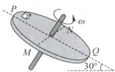 11. (多选,2024 河北保定期末)一倾角为 $ 30^{\circ} $ 的圆盘绕过圆心且垂直盘面的轴以大小为 $ \sqrt{\frac{g}{6r}} $ 的角速度匀速转动,盘面上有一个离转轴距离为 $ r $、质量为 $ m $ 的物块(可视为质点)随圆盘一起转动(相对盘面静止)。如图所示,$ P $ 点是物块运动的轨迹圆上的最高点,$ Q $ 点是物块运动的轨迹圆上的最低点,重力加速度大小为 $ g $,物块与圆盘间的最大静摩擦力等于滑动摩擦力。下列说法正确的是(