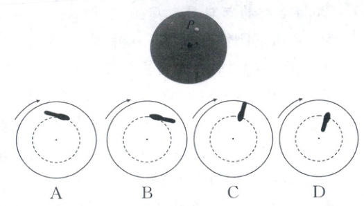 1. (2025 江苏无锡期中)如图所示,水平圆盘上 P 点有一滴粘稠液体,使圆盘绕竖直中心轴缓慢转动起来,则液体在圆盘上留下的痕迹示意图可能为 (