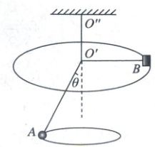 10. (2024 福建部分优质高中期末质量检测)一个半径为$R=0.5m$的水平转盘可以绕竖直轴$O'O''$转动,水平转盘中心$O'$处有一个光滑小孔,用一根长$L=1m$细线穿过小孔将质量分别为$m_{A}=0.2kg、m_{B}=0.5kg$的小球 A 和小物块 B 连接,小物块 B 放在水平转盘的边缘且与转盘保持相对静止,如图所示.现让小球 A 在水平面做角速度$ω_{A}=5rad/s$的匀速圆周运动,小物块 B 与水平转盘间的动摩擦因数$\mu =0.3$(取$g=10m/s^{2}$),求: