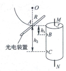9. (广东广州期中)如图所示,半径$R=0.20m$的$\frac {1}{4}$光滑圆弧轨道固定在竖直平面内,过最低点的半径 OA 处于竖直位置,在其右方有一可绕竖直轴 MN(与圆弧轨道共面)转动的、内部空心的圆筒,圆筒半径$r=0.10m$,筒的顶端与 A 点等高,圆筒上开有两个小孔 B、C,B、C 处于同一竖直线上,与筒顶的距离分别为$h_{1}=0.20m、h_{2}=0.45m$,开始时小孔 B、C 在图示位置(与圆弧轨道共面).现让一质量$m=0.10kg$的小物块自光滑圆弧轨道的某点由静止释放,到达 A 点时触动光电装置,使圆筒立刻以某一角速度匀速转动起来,结果小物块正好从小孔 B 进入圆筒,并从小孔 C 离开.不计空气阻力,g 取$10m/s^{2}$.求: