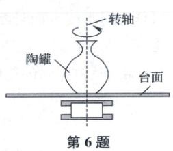 6.D 解析:与台面相对静止的陶屑做匀速圆周运动,静摩擦力提供向心力,当静摩擦力为最大静摩擦力时,根据牛顿第二定律,有$\mu mg = m \omega^2 r$,解得$r = \frac{\mu g}{\omega^2}$,因与台面相对静止的这些陶屑的角速度相同,可知能与台面相对静止的陶屑离转轴的距离与陶屑的质量无关,故A、B错误;离转轴最远的陶屑其受到的静摩擦力为最大静摩擦力,由以上分析可知最大的运动半径为$R = \frac{\mu g}{\omega^2}$,$\mu$与$\omega$均一定,故$R$为定值,即陶屑只能分布在一定半径的圆内,故D正确,C错误.