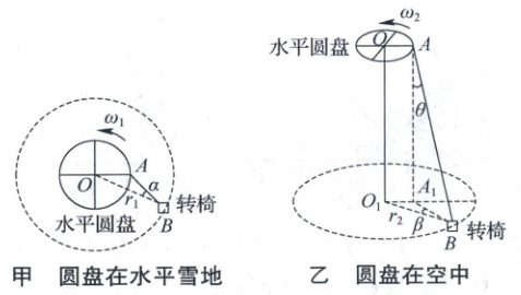 (1) 在图甲中,若圆盘在水平雪地上以角速度 $ \omega_1 $ 匀速转动,转椅运动稳定后在水平雪地上绕 $ O $ 点做半径为 $ r_1 $ 的匀速圆周运动. 求 $ AB $ 与 $ OB $ 之间夹角 $ \alpha $ 的正切值.
