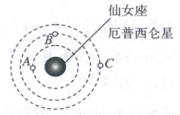 2. (2025 黑龙江大庆月考)天文学家发现,三颗行星$A$、$B$、$C$绕着仙女座厄普西仑星做匀速圆周运动,如图所示,行星$A$的周期为 4.617 0 d,轨道半径为 0.059 AU(地球与太阳之间的距离为 1 AU = 1.496×10⁸ km),引力常量$G$已知,根据题中数据可得到(