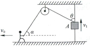 5. (2024 四川南充月考)如图所示,人用轻绳通过光滑轻质定滑轮拉穿在光滑竖直杆上的物块A,人以恒定速度v₀向左匀速拉绳,某一时刻,定滑轮右侧绳与竖直杆的夹角为θ,左侧绳与水平面的夹角为α,此时物块A的速度为v₁,则人拉绳的速度v₀为(