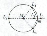 6. 拉格朗日点指在两个大天体引力作用下,能使小物体稳定的点(小物体质量相对两大天体可忽略不计). 这些点的存在由法国数学家拉格朗日于 1772 年推导证明的,1906 年首次发现运动于木星轨道上的小行星(见脱罗央群小行星)在木星和太阳的作用下处于拉格朗日点上. 在每个由两大天体构成的系统中,按推论有 5 个拉格朗日点,其中连线上有三个拉格朗日点,分别是 $ L_1 $、$ L_2 $、$ L_3 $,如图所示. 我国发射的“鹊桥”卫星就在地月系统平衡点 $ L_2 $ 点做周期运动,通过定期轨控保持轨道的稳定性,可实现对着陆器和巡视器的中继通信覆盖,首次实现地月 $ L_2 $ 点周期轨道的长期稳定运行. 设某两个天体系统的中心天体质量为 $ M $,环绕天体质量为 $ m $,两天体间距离为 $ L $,引力常量为 $ G $,$ L_1 $ 点到中心天体的距离为 $ R_1 $,$ L_2 $ 点到中心天体的距离为 $ R_2 $. 求: