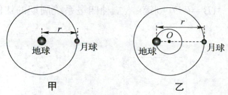 )A.图甲中月球绕地球运动的周期 $ T_1 $ 大于图乙中月球绕 $ O $ 点运动的周期 $ T_2 $