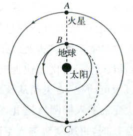 D.如果火星运动到 $ A $ 点,地球恰好在 $ B $ 点时发射探测器,那么探测器沿轨迹 $ BC $ 运动到 $ C $ 点时,恰好与火星相遇