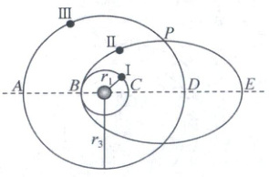 6. (多选,2025 江西临川一中质量监测)宇宙中有一孤立星系,中心天体周围有三颗行星,如图所示。中心天体质量远大于行星质量,不考虑行星之间的万有引力,三颗行星的运动轨道中,有两个为圆轨道,半径分别为 $ r_{1} $、$ r_{3} $,一个为椭圆轨道,半长轴为 $ a $,$ a = r_{3} $。在 $ \Delta t $ 时间内,行星Ⅱ、行星Ⅲ与中心天体连线扫过的面积分别为 $ S_{2} $、$ S_{3} $。行星Ⅰ的速率为 $ v_{1} $,行星Ⅱ在 $ B $ 点的速率为 $ v_{2B} $,行星Ⅱ在 $ E $ 点的速率为 $ v_{2E} $,行星Ⅲ的速率为 $ v_{3} $,下列说法正确的是(