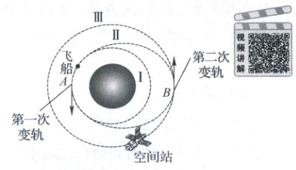 7. (多选,2024 浙江期中)2023 年 10 月 26 日 11 时 14 分,搭载“神舟十七号”载人飞船的“长征二号”F 遥十七运载火箭在酒泉卫星发射中心点火发射。17 时 46 分,“神舟十七号”载人飞船与空间站组合体完成自主快速交会对接。飞船的发射过程可简化为:飞船从预定轨道Ⅰ的 $ A $ 点第一次变轨进入椭圆轨道Ⅱ,到达椭圆轨道的远地点 $ B $ 时,再次变轨进入空间站的运行轨道Ⅲ,与空间站实现对接。假设轨道Ⅰ和Ⅲ都近似为圆轨道,不计飞船质量的变化,空间站轨道距地面的高度为 $ h $,地球半径为 $ R $,地球表面的重力加速度为 $ g $,下列说法正确的是(