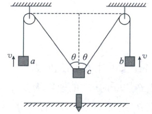 8. (2024 贵州黔西南自治州期末)打桩机是基建常用工具.某种简易打桩机模型如图所示,重物a、b和c通过不可伸长的轻质长绳跨过两个光滑的等高小定滑轮连接,c从与滑轮等高处加速下落,某时刻,a、b上升的速度为v,细绳与竖直方向的夹角均为θ,则对该时刻c的速度及重物a的运动状态说法正确的是(