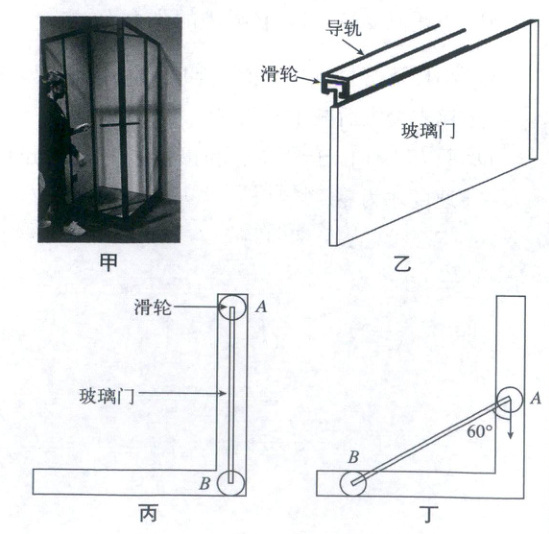 7. (2025 浙江绍兴期末)直角侧移门(如图甲所示)可以解决小户型浴室开关门不方便的问题,其结构可简化成如图乙和图丙(俯视图)所示,玻璃门的两端滑轮A、B通过一根可自由转动的轻杆连接,滑轮可沿直角导轨自由滑动,已知滑轮可视为质点,玻璃门的宽度为L = 1m,在某次关门的过程中,使用者拉住把手使滑轮A从初始位置静止开始做加速度为a = 0.25m/s²的匀加速运动,当玻璃门与滑轮A达到丁图所示位置时,滑轮B的速度大小为(