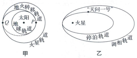 6. (浙江卷)“天问一号”从地球发射后,在如图甲所示的$P$点沿地火转移轨道运动到$Q$点,再依次进入如图乙所示的调相轨道和停泊轨道,则“天问一号”(