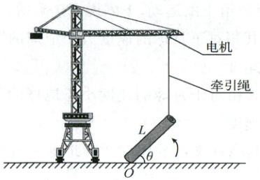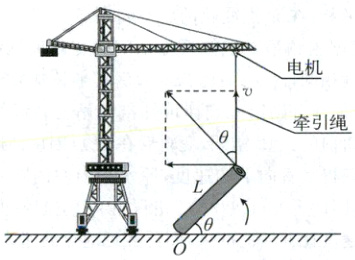 4. (2025 四川成都七中月考)如图所示,为了将横放在水平地面的钢管直立起来,工人控制起重机,使横梁上的电机水平移动,同时以速度$v$匀速收短牵引绳,使钢管绕定点$O$转动,绳始终保持竖直且与钢管在同一竖直面内,钢管长为$L$,以下说法正确的是(