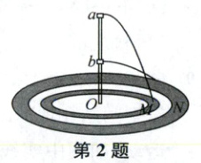 2. (2025 河南创新发展联盟月考)如图所示,$M$、$N$是水平地面上以$O$为圆心、半径不同的环形花坛.位于圆心处的竖直管上有两截面相同的微型水平喷水嘴$a$和$b$,分别给$M$和$N$浇水,$h_{a} = 2h_{b}$.调节两喷水嘴的出水速度$v$和转动的角速度$\omega$,使喷出的水全部落入相应的花坛中.若喷水嘴$a$和$b$各自转动一周过程中,落入$M$和$N$单位长度的水量相同,不计空气阻力和花坛的宽,角速度$\omega_{a}$和$\omega_{b}$的比值为(