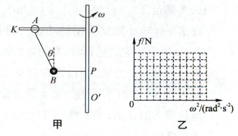 10. (2024 安徽铜陵期末)如图甲所示,水平杆$KO$可绕竖直转轴$O'O$转动,小环$A$套在水平杆$KO$上并与小球$B$通过细线连接,静止时细线与竖直方向的夹角$\theta = 37^{\circ}$,水平细线$P$端固定在转轴上,已知$m_{A} = 0.6\ kg$,$m_{B} = 0.4\ kg$,$AB$线长$L = 0.5\ m$,$BP$线长$d = 0.2\ m$.$(g$取$10\ m/s^{2}$,$\sin37^{\circ}$取$0.6$,$\cos37^{\circ}$取$0.8)$