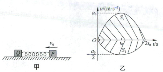 7. (2024 江苏无锡期中)如图甲所示,质量为 $ m $ 的物块 $ P $ 与物块 $ Q $(质量未知)之间拴接一轻质弹簧,静止在光滑的水平地面上,弹簧恰好处于原长. 现给物块 $ P $ 一瞬时初速度 $ v_0 $,并把此时记为 $ 0 $ 时刻,规定向左为正方向,$ 0 \sim 2t_0 $ 内 $ P $、$ Q $ 物块运动的 $ a - t $ 图像如图乙所示,其中 $ t $ 轴下方部分的面积大小为 $ S_1 $, $ t $ 轴上方部分的面积大小为 $ S_2 $,则 (