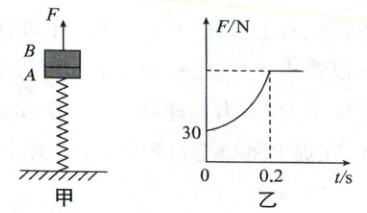 8. (多选,2025 广西南宁二中调研)如图甲所示,轻弹簧一端固定在地面上,另一端与质量为 $ m_A = 1 \, kg $ 的物块 $ A $ 相连,物块 $ B $ 叠放在物块 $ A $ 上但不与 $ A $ 相连,$ m_B = 2 \, kg $. 开始时整个系统处于静止状态,从 $ t = 0 $ 时刻开始,对 $ B $ 施加一竖直向上的力 $ F $ 使物块 $ B $ 做匀加速直线运动. 力 $ F $ 随时间 $ t $ 变化的规律如图乙所示,取重力加速度 $ g = 10 \, m/s^2 $,下列说法正确的是 (
