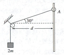 12. (多选,2025 江西景德镇一期末)如图所示,将质量为2m的重物悬挂在轻绳的一端,轻绳的另一端系一质量为m的小环,小环套在竖直固定的光滑直杆上,光滑定滑轮与直杆的距离为d.现将小环从图中所示的A处由静止释放,整个过程中重物都只在竖直方向运动.下落过程中小环的最大速度为v₁(此时重物的速度大小为v₂),重力加速度为g,下列说法正确的是(