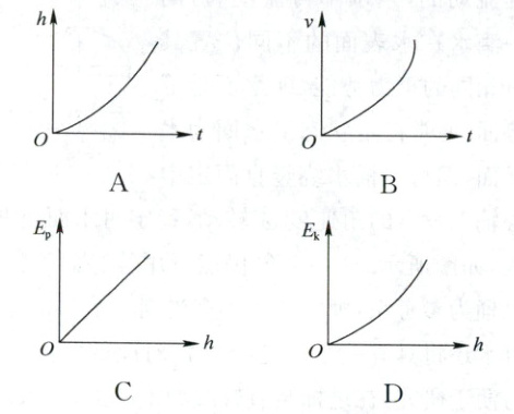 1.A解析:毽子在下落过程中,受到的空气阻力大小与其下落的速度大小成正比,有$mg - kv = ma$,合外力逐渐减小,则加速度逐渐减小,最后加速度可能减小为0,即速度先增大后不变,则$h - t$图像的斜率先增大后不变,故A正确,B错误;设毽子原来距地面的高度为$H$,则其重力势能表达式为$E_p = mgH - mgh$,故$E_p - h$图像是一条向下倾斜的直线,故C错误;由动能定理可知$E_k = (mg - kv)h$,可知$E_k - h$图像斜率表示合外力,毽子下落过程中,合外力逐渐减小,故$E_k - h$图像斜率逐渐减小,D错误。