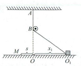 6. (多选,2024 湖南期末)如图所示为某实验装置示意图,A、B、O 在同一直线上,一根轻质弹性绳一端固定在天花板上 A 点,另一端绕过 B 处的光滑定滑轮后系在一个质量为 m = 1.2 kg 的可视为质点的小物体上,小物体置于地面上 O 点时,弹性绳中弹力为 $\frac{1}{2}mg$,将小物体向右推到 O₁点,OO₁距离为 $x_1 = 0.4$ m,小物体由静止释放,并水平向左滑行. 当小物体经过 O 点时与弹性绳脱离,之后恰能运动至 M 处,OM 距离为 s = 0.1 m,已知弹性绳原长等于 AB 距离,且始终不超过弹性限度,弹性势能为 $E_p = \frac{1}{2}k(\Delta l)^2$,$\Delta l$ 为形变量大小,小物体与地面间的动摩擦因数为 $\mu = 0.5$,g 取 10 m/s²,则从 O₁到 M 的过程中,下列说法正确的是 (