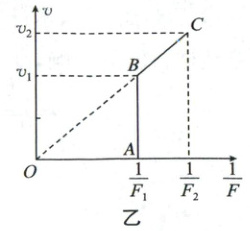 4. (多选,2025 山东百师联考期中)如图甲所示,某同学用轻绳通过定滑轮提升一重物,运用传感器(未在图中画出)测得此过程中不同时刻被提升重物的速度v与对轻绳的拉力F,并描绘出图像.假设某次实验得到的图像如图乙所示,其中第一个时间段内线段AB与v轴平行,B点对应的坐标为$(\frac{1}{F_{1}},v_{1})$,第二个时间段内线段BC的延长线过原点,第三个时间段内拉力F和速度v均与C点的坐标$(\frac{1}{F_{2}},v_{2})$对应,大小均保持不变,因此图像上没有反映.实验中测得第二个时间段内所用时间为t.重力加速度为g,滑轮质量、摩擦和其他阻力均可忽略不计.下列说法正确的是(