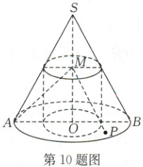 10. [2024·芜湖检测]如图,在圆锥 SO 中,轴截面 SAB 是边长为 2 的等边三角形,M 为高 SO 上一动点,圆柱 MO 为圆锥 SO 的内接圆柱(内接圆柱的两个底面的圆周都在圆锥表面上),P 为圆锥底面的动点,且 AM⊥MP,则(