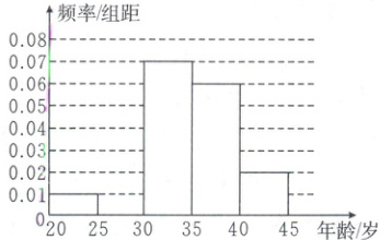 (1)设年龄组$[25,30)$对应小矩形的高度为$h$,则$5×(0.01+h+0.07+0.06+0.02)=1$,解得$h=0.04$.