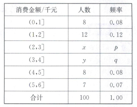 5. [2024·天水一中月考]蓝天购物广场某营销部门随机抽查了2023年中秋节假期期间100名市民在购物广场的消费金额,所得数据如表所示,已知消费金额不超过3千元与超过3千元的人数比恰为3:2。