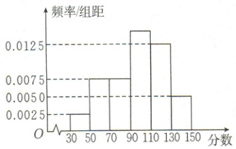 4.122【解析】设初赛成绩在[90,110)的频率为a,则(0.0025 + 0.0075 + 0.0075 + a + 0.0125 + 0.0050)×20 = 1。所以a=0.0150.初赛成绩在110分以下的频率为(0.0025 + 0.0075 + 0.0075 + 0.0150)×20 = 0.65。初赛成绩在130分以下的频率为0.65 + 0.0125×20 = 0.90。所以初赛成绩的第80百分位数一定在[110,130)内。由$110+\frac{0.80 - 0.65}{0.90 - 0.65}×20 = 122,$所以估计初赛成绩的第80百分位数是122.
