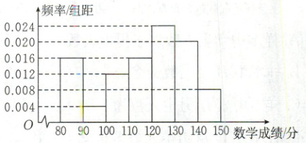 5.134【解析】考生中成绩在130分以下的频率为(0.016 + 0.004 + 0.012 + 0.016 + 0.024)×10 = 0.72,考生中成绩在140分以下的频率为0.72 + 0.020×10 = 0.92,所以成绩的第80百分位数一定在[130,140)之间。由$130+\frac{0.8 - 0.72}{0.92 - 0.72}×10 = 134,$估计考生成绩的第80百分位数为134.