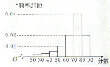 (2)根据题意,样本中分数不小于50的频率为(0.01 + 0.02 + 0.04 + 0.02)×10 = 0.9,分数在区间[40,50)内的人数为100 - 100×0.9 - 5 = 5。所以估计总体中分数在区间[40,50)内的人数为$400×\frac{5}{100}=20。$
