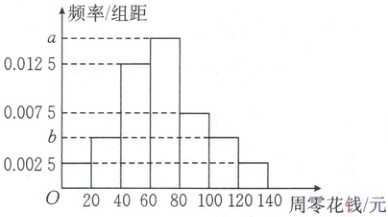 7. [2024·云南师大附中期中]随着现代社会物质生活水平的提高,中学生的零花钱越来越多,消费水平也越来越高,因此滋生了一些不良的攀比现象.某学校为帮助学生培养正确的消费观念,对该校学生每周零花钱的数额进行了随机调查,现将统计数据按$[0,20)$,$[20,40),·s,[120,140]$分组后绘成如图所示的频率分布直方图,已知$a = 3b$.