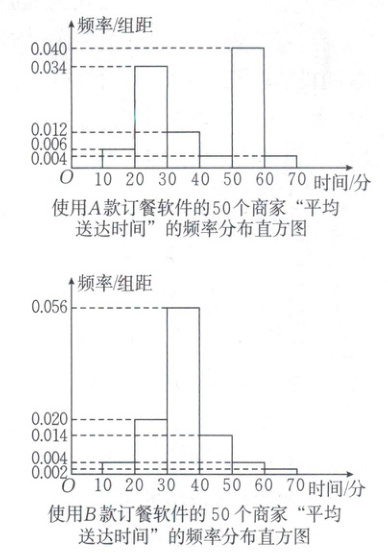 ②因为使用B款订餐软件的50个商家的“平均送达时间”的平均数为15×0.04+25×0.20+35×0.56+45×0.14+55×0.04+65×0.02=35<40,用样本估计总体,所以使用B款订餐软件的商家的“平均送达时间”的平均数小于使用A款订餐软件的商家的“平均送达时间”的平均数,所以选择B款订餐软件.