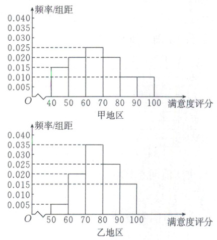 乙地区$[50,70)$的频率为$(0.005 + 0.020)×10 = 0.25$,$[70,80)$的频率为$0.035×10 = 0.35$,所以乙地区用户满意度评分的中位数$m_2 = 70 + \frac{0.5 - 0.25}{0.35}×10≈77.1$,乙地区的平均数$x_2 = 55×0.005×10 + 65×0.020×10 + 75×0.035×10 + 85×0.025×10 + 95×0.015×10 = 77.5$,所以$m_1 < m_2$,$x_1 < x_2$。故选 BC。