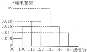 7.A 【解析】分析可知,10×(m + 0.020 + 0.016 + 0.016 + 0.011 + 0.006)=1,解得m = 0.031,故A说法正确;因为不低于140分的频率为0.011×10 = 0.11,所以$n = \frac{110}{0.11}=1000,$故B说法错误;因为100分以下的频率为0.006×10 = 0.06,所以100分以下的人数为1000×0.06 = 60,故C说法错误;成绩在区间[120,140)内的频率为0.031×10 + 0.016×10 = 0.47 < 0.5,人数占小半,故D说法错误.