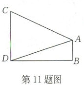11.B 【解析】由题意得,$AD^2 = 60^2 + 20^2 = 4000$,$AC^2 = 60^2 + 30^2 = 4500$.在$\triangle CAD$中,由余弦定理的推论,得$\cos \angle CAD = \frac{AD^2 + AC^2 - CD^2}{2AD · AC} = \frac{\sqrt{2}}{2}$,故$\angle CAD = 45°$.故选B.