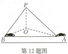 12. [2024·太原五中月考](多选)如图,某人在一条水平公路旁的山顶P处测得小车在A处的俯角为30°,该小车在公路上由东向西匀速行驶7.5分钟后,到达B处,此时测得俯角为45°.已知小车的速度是20 km/h,且cos∠AOB=-$\frac{3\sqrt{3}}{8}$,则(