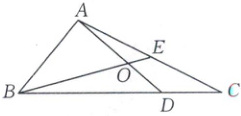 (2)因为$\overrightarrow{AD}=\frac{2}{3}\overrightarrow{AC}+\frac{1}{3}\overrightarrow{AB}$,$\overrightarrow{BE}=\frac{1}{2}\overrightarrow{AC}-\overrightarrow{AB}$,所以$\overrightarrow{AD}·\overrightarrow{BE}=(\frac{2}{3}\overrightarrow{AC}+\frac{1}{3}\overrightarrow{AB})(\frac{1}{2}\overrightarrow{AC}-\overrightarrow{AB})=\frac{1}{3}\overrightarrow{AC}^{2}-\frac{1}{2}\overrightarrow{AC}·\overrightarrow{AB}-\frac{1}{3}\overrightarrow{AB}^{2}=\frac{1}{3}×4^{2}-\frac{1}{2}×(-4)-\frac{1}{3}×2^{2}=6$,所以$\cos\angle EOD=\frac{\overrightarrow{AD}·\overrightarrow{BE}}{|\overrightarrow{AD}||\overrightarrow{BE}|}=\frac{6}{\frac{2\sqrt{13}}{3}×2\sqrt{3}}=\frac{3\sqrt{39}}{26}$。