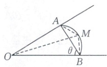 13. [2024·无锡一中期中]如图,某地修建了一座避暑山庄 O,为吸引游客,准备在门前两条夹角为 $\frac{\pi}{6}$(即∠AOB)的小路之间修建一处弓形花园. 已知弓形花园的弦长 AB = 2√3,且点 A,B 落在小路上,记弓形花园的顶点为 M,且∠MAB = ∠MBA = $\frac{\pi}{6}$,设∠OBA = θ.