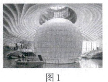 9. [2024·天津一中月考]天津滨海新区文化中心地处天津滨海新区开发区,是天津乃至京津冀地区的标志性文化工程.其中滨海图书馆建筑独具特色,被称为“滨海之眼”,如图 1 所示.为了测量馆中球的半径,小明设计了两个方案.方案甲:构造正三棱柱,其侧面均与球相切,底面边长约为 $30$ m,如图 2 所示,估计此时球的完整表面积为
