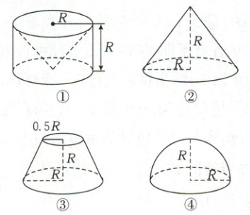 2.D [解析]设截面与(下)底面的距离为h,则①中截面内圆半径为h,则截面圆环的面积为$\pi(R^{2}-h^{2})$;②中截面圆的半径为$R - h$,则截面圆的面积为$\pi(R - h)^{2}$;③中截面圆的半径为$R-\frac{h}{2}$,则截面圆的面积为$\pi(R-\frac{h}{2})^{2}$;④中截面圆的半径为$\sqrt{R^{2}-h^{2}}$,则截面圆的面积为$\pi(R^{2}-h^{2})$.所以①与④中截面的面积相等,又①中几何体的高与④中半球的半径相等,所以①④满足祖暅原理.故选D.